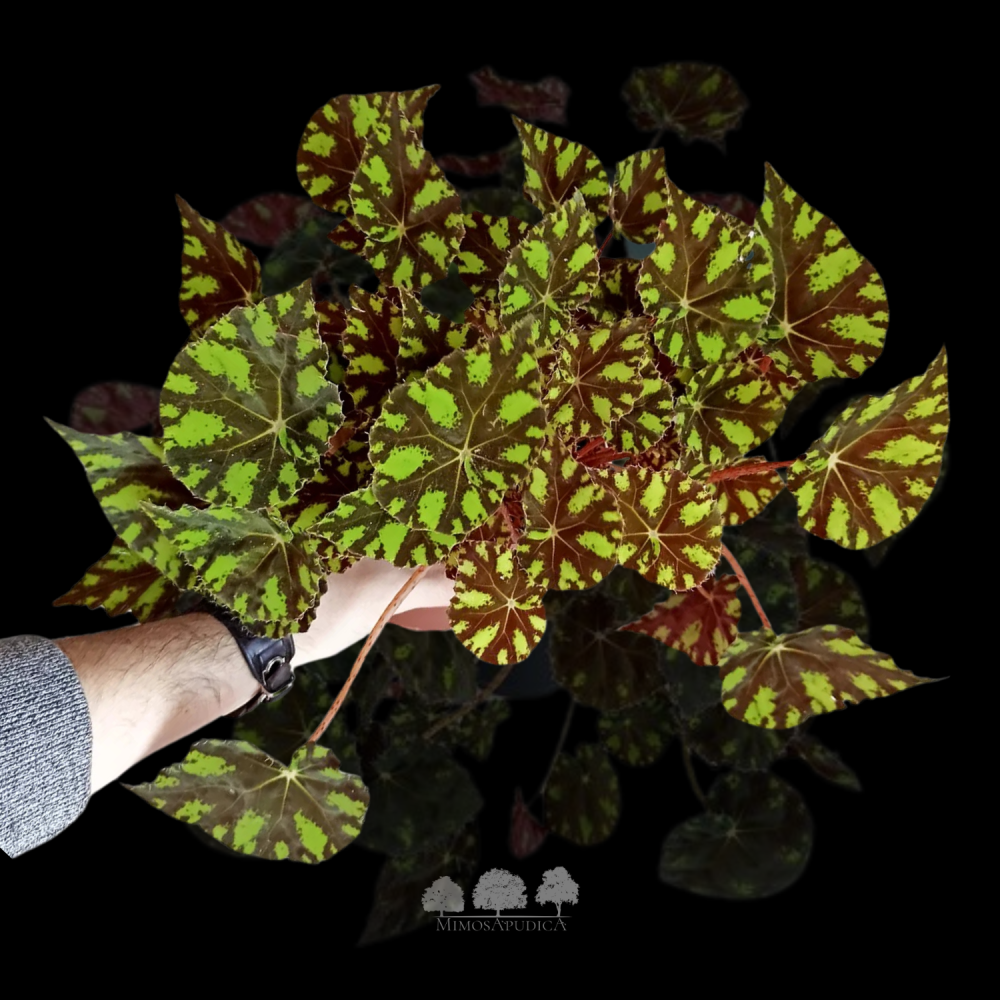 Begonia bowerae ‘Kareem’ is a rare tropical plant known for its small, heart-shaped emerald green leaves adorned with chocolate markings and fine hairs along the edges, giving it a unique and attractive appearance. Its creeping growth habit makes it ideal for indoor spaces or terrariums.
