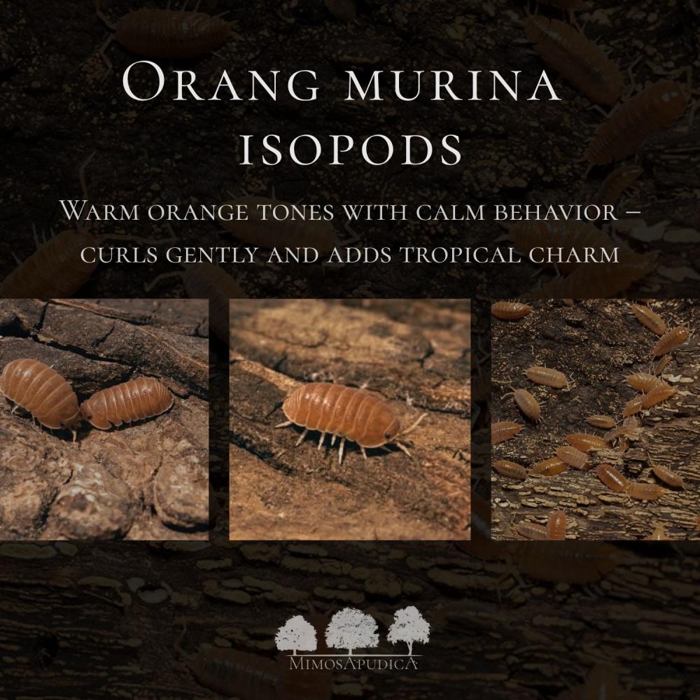 Orange Murina isopods are ideal for humid bioactive setups and are well-suited for both beginners and experienced keepers due to their ease of care and steady reproduction in stable environments.